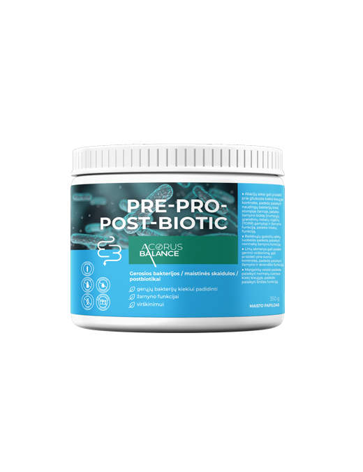 Sastāvdaļas: sarkanās akācijas (Acacia Seyal) sveķu pulveris Fibregum B™, ceļtekas (Plantago ovata) sēklu apvalki, samalti āboli (Malus domestica), samaltas sējas linu (Linum usitatissimum) sēklas, kukurūzas (Zea mays) graudu pulveris Promitor®, fermentēts 36 augļu un dārzeņu maisījums Fibriotics® (āboli, burkāni, zīdkoka ogas, ananasi, redīsi, citroni, apelsīni, bietes, plūmes, kaltētas plūmes, pasifloras, arbūzi, mežrozītes, acerolās (Malpighia glabra), sparģeļi, banāni, mellenes, upeņu ogas, brokoļi, ķirši, aronijas, dzērvenes, ērkšķogas, vīnogas, greipfrūti, vilkābeles, dateles, ličiji, melones, papajas, persiki, bumbieri, granātāboli, avenes, zemenes, tomāti) ar postbiotikām (sviestskābe, etiķskābe, polifenoli, vismaz 500 miljoni KSV/g paraprobiotiku), sarkano akāciju sveķu un fruktooligosaharīdu pulveris FloraciaTM, parasto cigoriņu (Cichorium intybus) saknes, mārdadža (Silybum marianum) sēklas, inulīns, dzīvās baktērijas: Bifidobacterium longum, Bifidobacterium infantis, Bifidobacterium adolescentis, Bifidobacterium breve, Lactobacillus plantarum, sporveida labvēlīgās baktērijas Bacillus coagulans (Lactospore®).